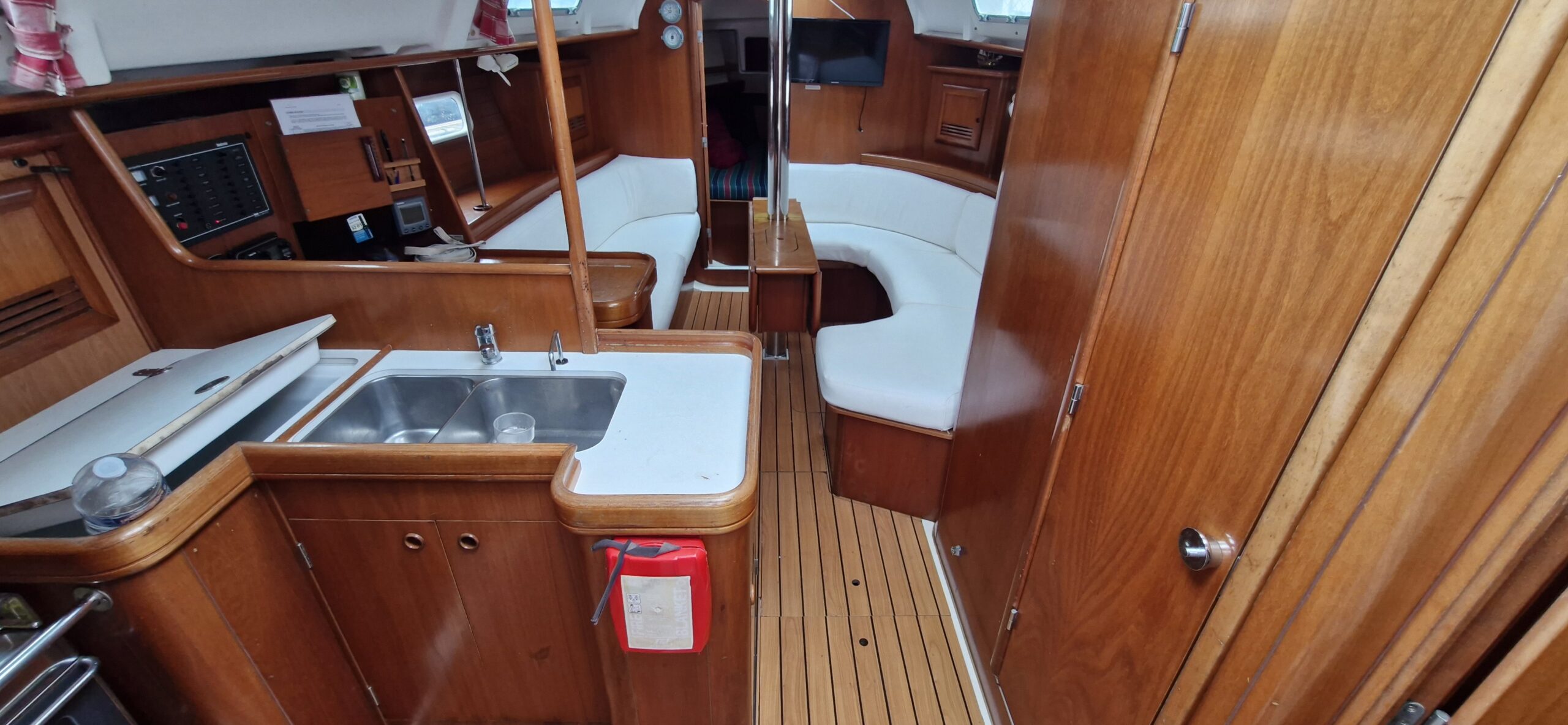 Confort : Cockpit teck, Bimini, Capote de descente, Table de cockpit, Douche de cockpit, Sellerie intérieur récente