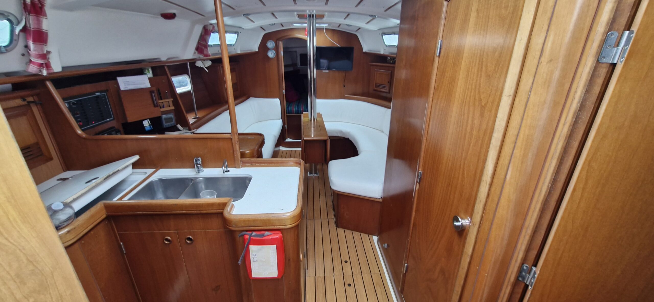 3 Cabines : Cabine avant propriétaire, 2 Cabine arrière double ,Grande salle d’eau avec espace douche