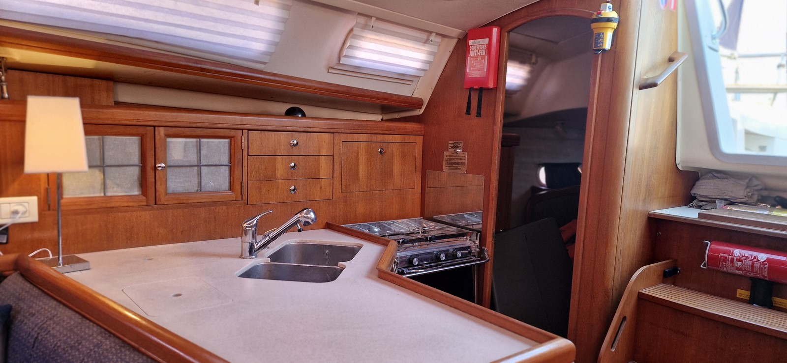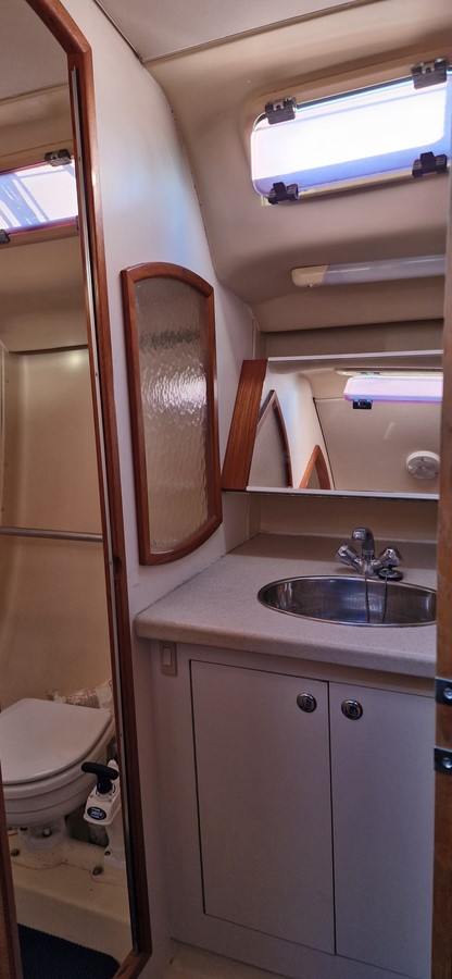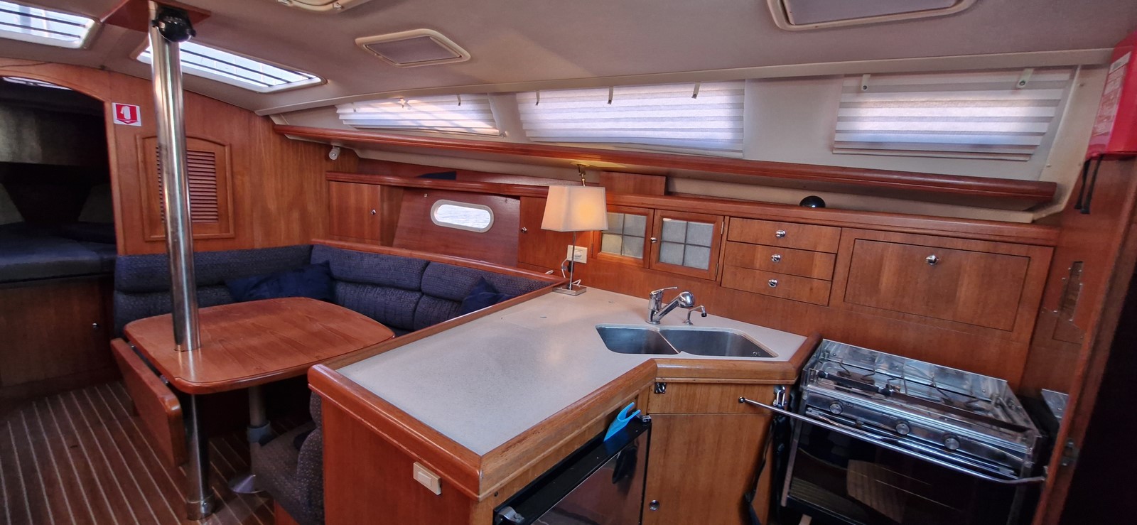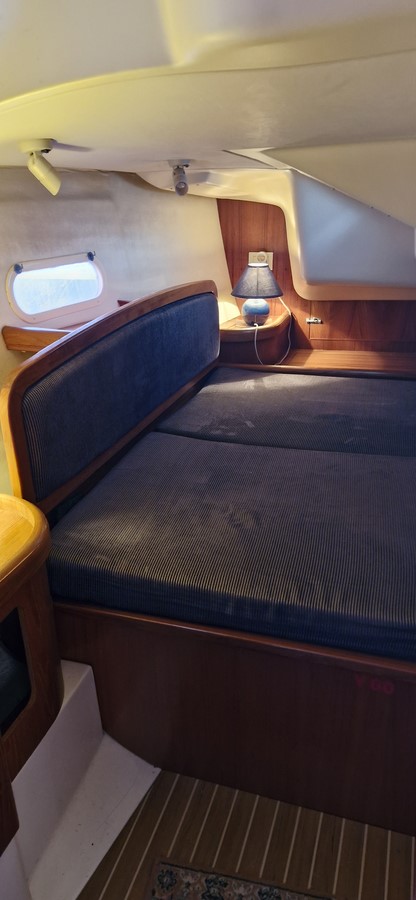 Confort : Grand frigo avec ouverture latéral, Gazinière avec four, Douche de cockpit, Winch selft-Tailling, Pompe eau de mer, Grande cabine arrière confortable